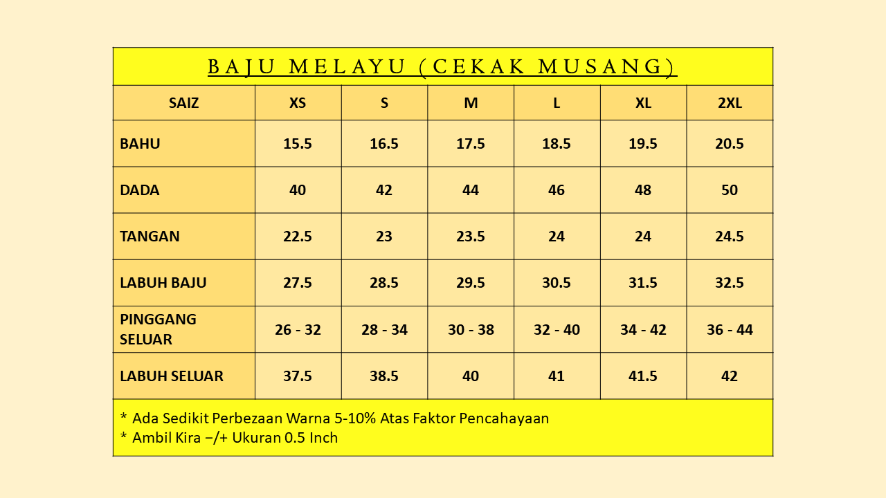 * Terdapat saiz XS, S, M, L, XL, 2XL